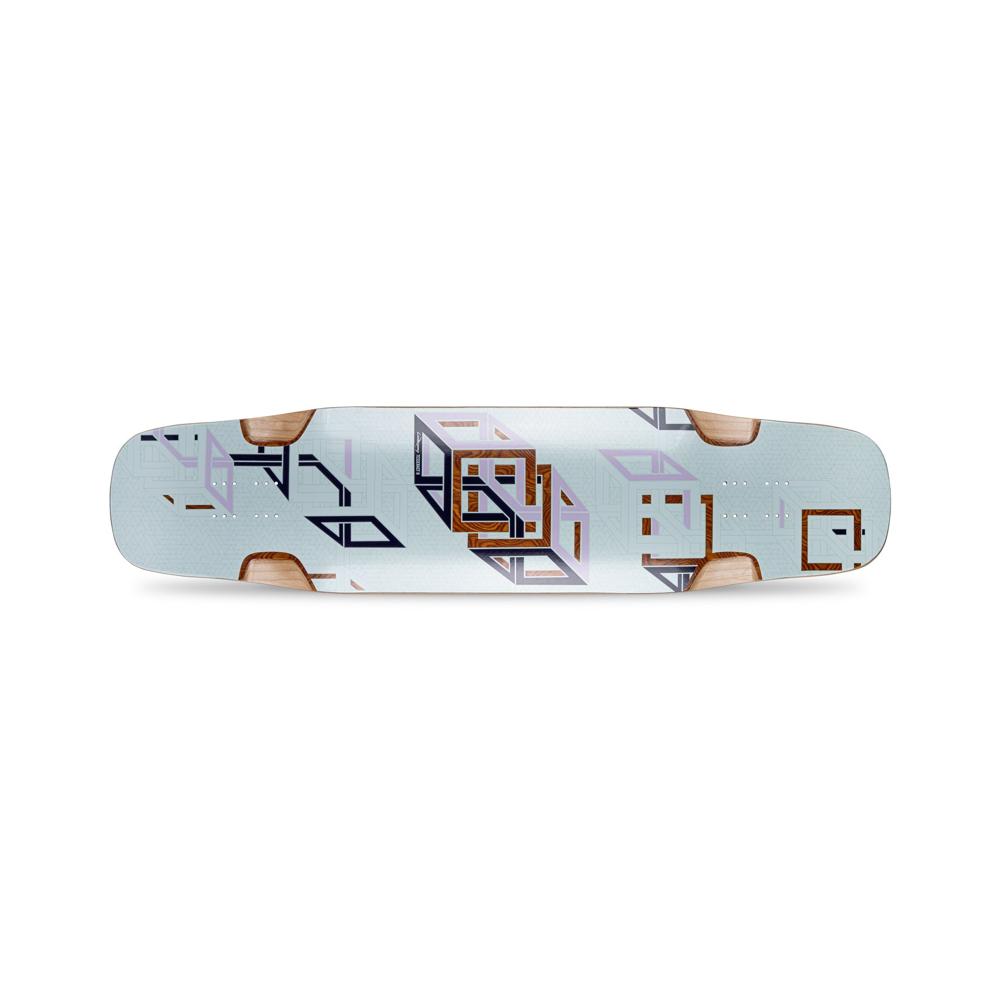 This deck is built for intermediate to advanced riders seeking progression in both technical freeride and expressive freestyle. The micro-drop profile improves leverage and stability without a rocker, the tub concave enhances edge control, and the machined wheel wells increase clearance for larger wheels and deeper turns. Six plies of long-grain maple paired with tri-axial fiberglass top and bottom create a balance of longitudinal stiffness, torsional rigidity, durability, and responsive pop. Laser-cut 50-grit griptape provides consistent traction, while the flat mounting interface keeps setup variables straightforward. At rest, the structured, angular graphic remains dark and veiled; in sunlight, photochromic detail emerges to suggest layers beyond immediate sight.