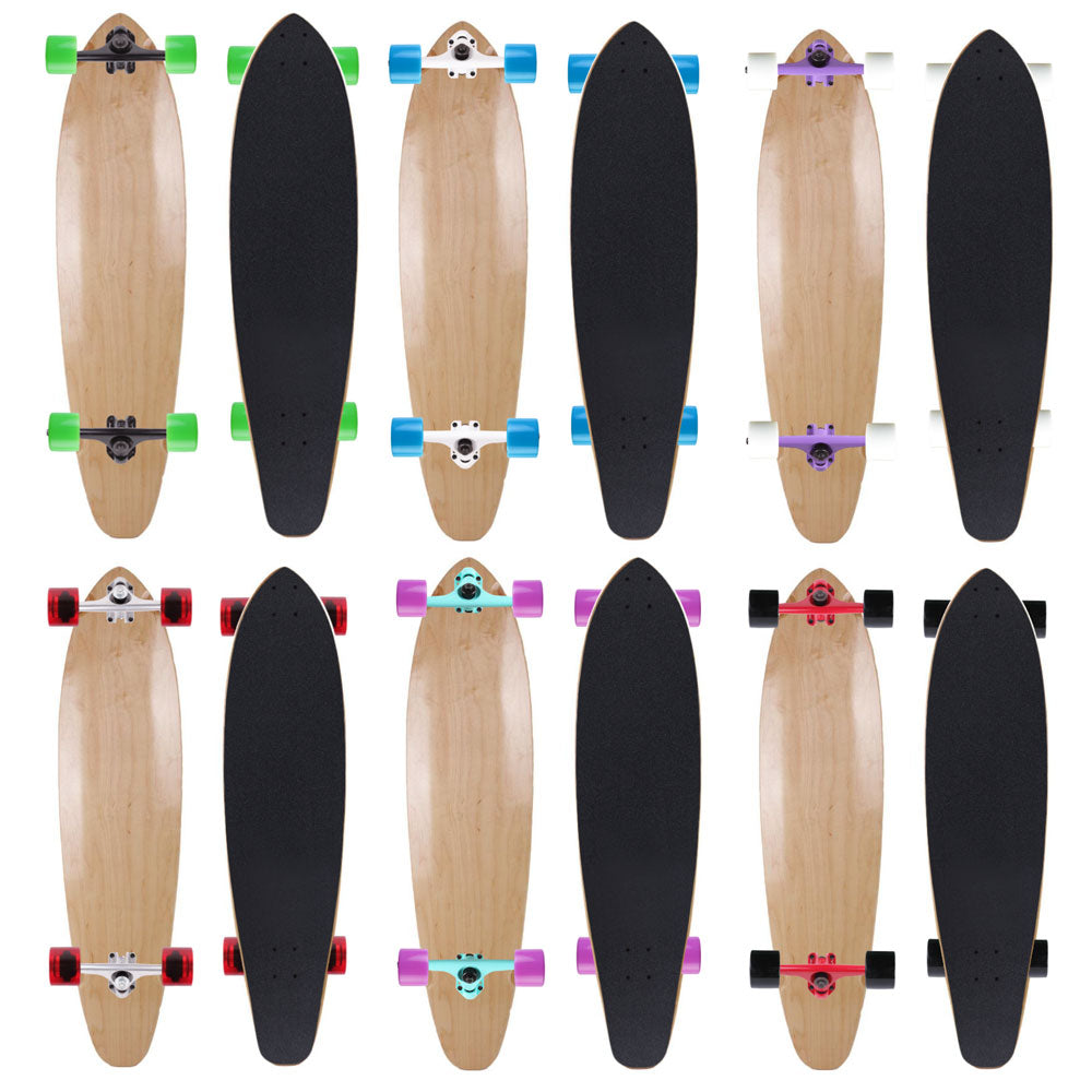 You can customize your own kicktail longboard skateboard 40" x 9.25" complete. You have options in wheel color and truck color. All decks have a natural wood color.